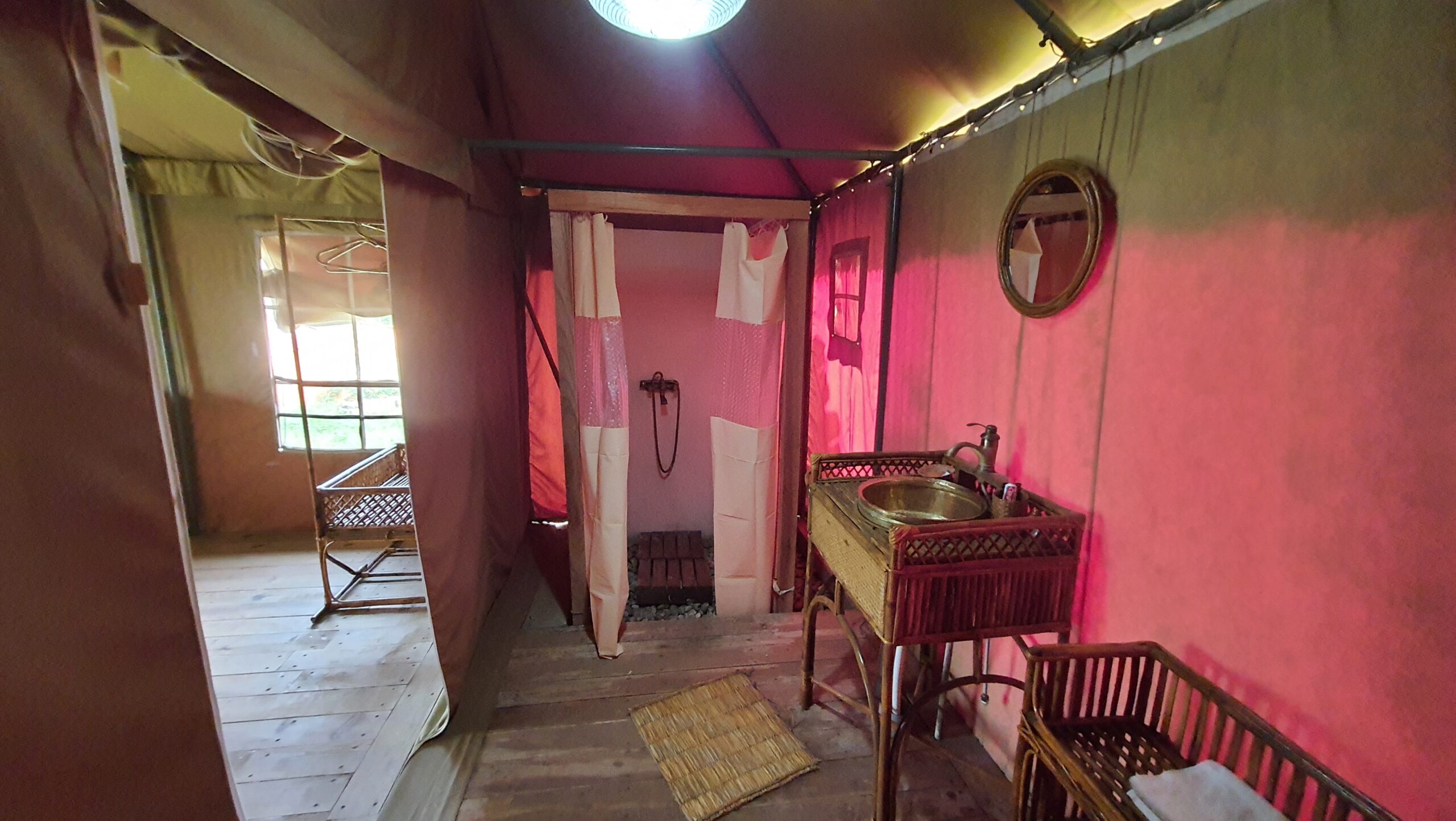 Jedes Zelt ist mit einem großen Bett und Sofa ausgestattet. Auf der Rückseite gibt es ein Badezimmer mit westlicher Toilette, Dusche (mit Warmwasser). Für die warmen Sommermonate gibt es auch einen Ventilator. Moskitonetz ist auch vorhanden, sehr wichtig! Abends können Sie in einem offenen Restaurant mit Blick auf die Umgebung essen: Grillen in der Natur.